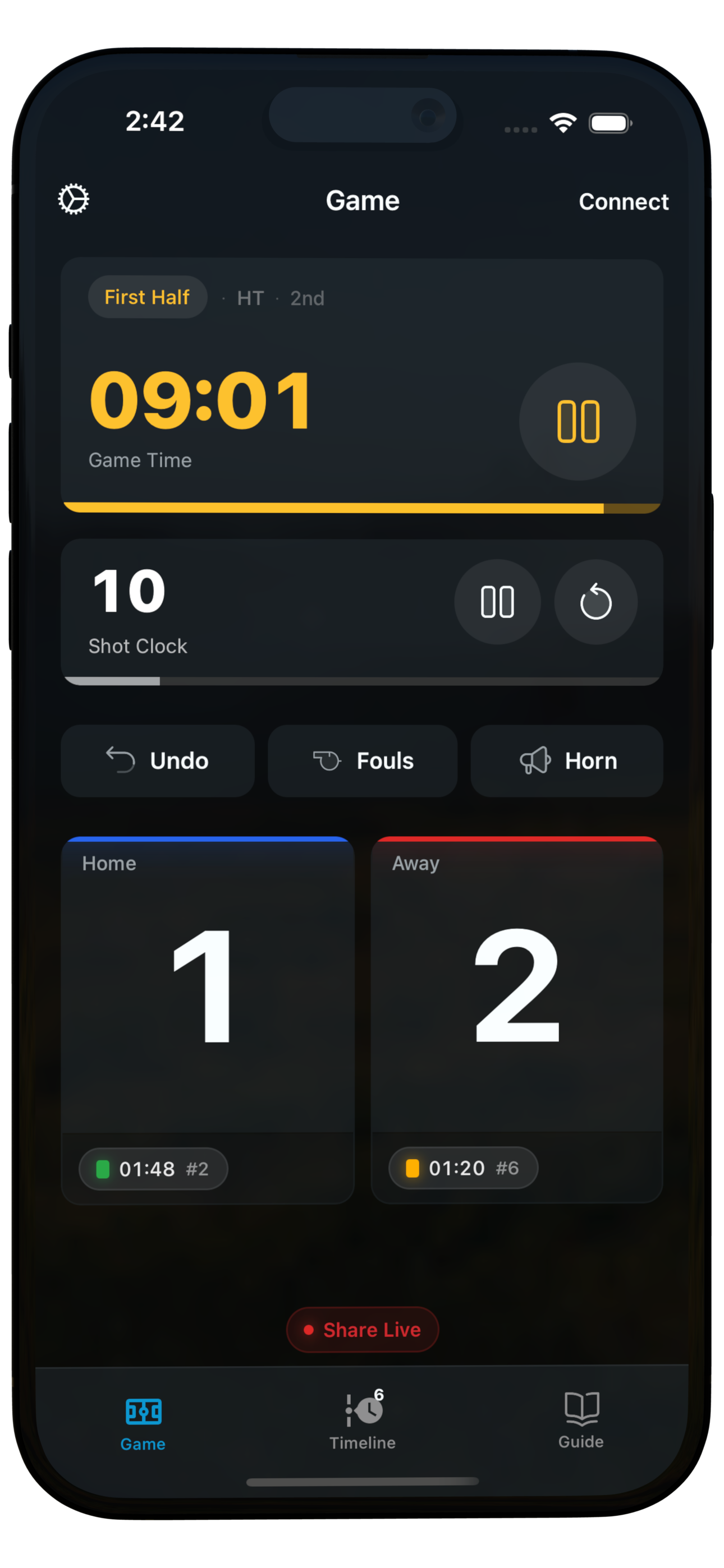 Score from your phone, display on our smart scoreboard, and share live with spectators via QR.